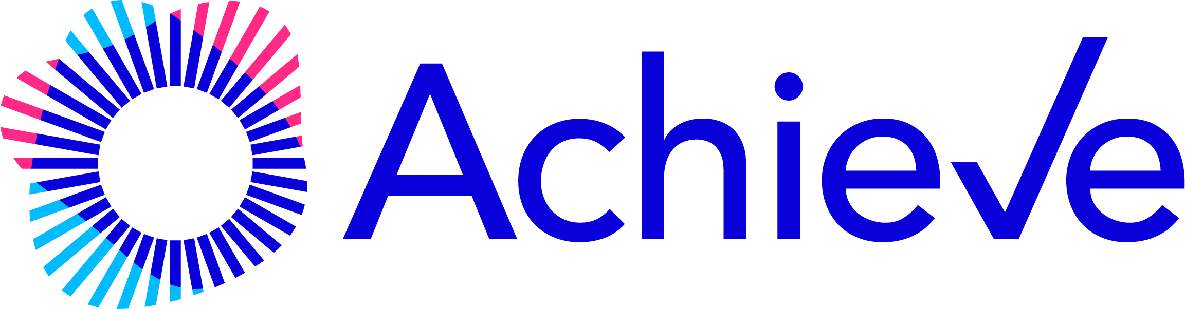 <!-- symbol code --> <svg xmlns="http://www.w3.org/2000/svg" width="624" height="206" role="img"> <title>Achieve</title> <use href="/_assets/prs-logos.svg?bust=20251114194814642#achieve" /> </svg> <!-- OR -- full svg --> <svg xmlns="http://www.w3.org/2000/svg" width="624" height="206" role="img"> <title>Achieve</title> <g class="logo-burst"> <path fill="#FF2986" d="m120.2 40.57v-5.23c-1.69.62-4.97 2.05-4.97 2.05 1.64.95 3.3 2 4.97 3.18zm-56.85 17.93c-1.46.31-5.63 1.2-6.13 1.34l4.39 3.68c.63-1.87 1.22-3.55 1.75-5.02zm-4.1 12.23-11.52-6.65c-1.4847982.9847754-2.8741881 2.1063311-4.15 3.35l14.19 8.19c.49-1.7.99-3.33 1.47-4.89zm-3.31 11.5-18.14-6.61c-.67 1.5-1.19 3.08-1.56 4.72l18.47 6.72c.4-1.65.81-3.26 1.23-4.84zm-2.68 11.24-17.26-3.05c.29 1.73.75 3.5 1.39 5.29l14.89 2.63c.31-1.64.63-3.27.97-4.88zm-2.09 11.4h-9.03c1.12 1.65 2.4 3.3 3.85 4.97h4.5c.2-1.66.43-3.32.68-4.97zm124.75-5.25 1.16-.21c-.15-1.6-.26-3.27-.36-4.99l-2.87.51c.76 1.55 1.45 3.11 2.06 4.69zm-4.48-9.18 5.02-1.83c-.06-1.73-.11-3.47-.15-5.24l-7.58 2.76c.95 1.42 1.86 2.86 2.7 4.31zm-5.4-8.11 10.1-5.83c-.05-1.9-.12-3.78-.19-5.63l-13.02 7.52c1.07 1.3 2.11 2.61 3.11 3.95zm-5.96-7.28 15.3-12.84c-.2-2.07-.44-4.04-.76-5.85l-17.91 15.03c1.15 1.2 2.27 2.43 3.37 3.67zm-6.37-6.73 17.88-21.3c-.84-1.58-1.79-3.03-2.84-4.34l-18.62 22.18c1.21 1.14 2.41 2.29 3.58 3.46zm-6.86-6.46 14.71-25.49c-1.41-.86-2.9-1.6-4.45-2.24l-14.07 24.38c1.27 1.09 2.55 2.21 3.81 3.34zm-7.56-6.51 8.59-23.61c-1.69-.22-3.41-.35-5.15-.39l-7.53 20.68c1.35 1.08 2.71 2.19 4.08 3.32zm-8.66-6.92 2.91-16.5c-1.74.25-3.49.59-5.22.99l-2.13 12.1c1.45 1.1 2.93 2.24 4.45 3.41z" /> <path fill="#00BCFF" d="m108.53 40.95-1.3-7.36c-1.81-.68-3.59-1.22-5.34-1.63l2.08 11.78c1.39-.85 2.9-1.78 4.56-2.79zm-10.11 6.14-5.85-16.09c-1.75.07-3.44.28-5.06.63l6.52 17.92c1.38-.72 2.81-1.53 4.39-2.46zm-9.77 4.95-9.81-16.99c-1.43.87-2.77 1.86-4.03 2.97l9.05 15.68c1.73-.52 3.3-1.06 4.79-1.65zm-11.27 3.38-8.54-10.18c-.92 1.52-1.72 3.15-2.42 4.85l5.51 6.57c2-.44 3.81-.85 5.45-1.24zm-24.43 60.83-3.12.55c-.12 1.7-.21 3.4-.26 5.09l8.65-1.53c-1.94-1.48-3.7-2.85-5.28-4.12zm10.58 8.18-13.92 5.07c.07 1.74.19 3.46.37 5.16l18.21-6.63c-1.62-1.27-3.17-2.46-4.65-3.6zm8.34 6.52-20.61 11.9c.38 1.7.82 3.35 1.34 4.97l23.42-13.52c-1.3771085-1.124356-2.7604632-2.24104-4.15-3.35zm7.03 5.73-22.89 19.21c.8 1.48 1.69 2.9 2.67 4.25l24.08-20.2c-1.31-1.13-2.59-2.21-3.85-3.26zm6.37 5.47-20.55 24.5c1.26 1.04 2.6 2.02 4.05 2.91l20.23-24.1c-1.26-1.14-2.5-2.24-3.72-3.3zm6.25 5.6-14.75 25.55c1 .34 4.3 1.25 4.94 1.38l13.56-23.5c-.62-.55-3.13-2.85-3.76-3.43zm6.69 5.92-7.92 21.76c1.71 0 3.5-.05 5.36-.18l6.72-18.45c-1.37-.95-2.75-2-4.15-3.13zm7.84 5.51-2.68 15.22c1.7-.25 3.44-.54 5.2-.88l2.07-11.73c-1.26-.65-4.33-2.45-4.59-2.6zm9.18 12.89c1.65-.4 3.31-.84 4.97-1.31v-5.42c-1.691703-.37556-3.352991-.876955-4.97-1.5zm10.31-6.01.52 2.93c1.59-.52 3.18-1.07 4.76-1.65l-.26-1.45c-1.69.19-3.36.25-5.02.17z" /> <path fill="#0900DA" d="m115.23 71.29h4.97v-30.72c-1.610304-1.1307719-3.268503-2.1917526-4.97-3.18zm-1.33.12-5.37-30.46c-1.66 1.01-3.16 1.94-4.56 2.79l5.03 28.53zm-10.86 2.91 4.67-1.7-9.29-25.53c-1.58.93-3.02 1.74-4.39 2.46l9.02 24.77zm-5.51 3.05 4.31-2.49-13.19-22.84c-1.49.59-3.05 1.13-4.79 1.65l13.67 23.67zm-4.9 3.96 3.81-3.2-19.05-22.71c-1.64.39-3.45.8-5.45 1.24l20.69 24.66zm-4.14 4.75 3.2-3.81s-28.33-23.77-28.34-23.77c-.52 1.46-1.12 3.15-1.75 5.02zm-3.25 5.4 2.49-4.31-28.47-16.44c-.49 1.56-.98 3.19-1.47 4.89l27.46 15.85zm-2.27 5.88 1.7-4.67-28.73-10.46c-.42 1.58-.83 3.2-1.23 4.84zm-1.2 6.18.86-4.9-29.37-5.18c-.34 1.61-.67 3.23-.97 4.88zm-.12 6.3v-4.97h-30.48c-.25 1.65-.48 3.31-.68 4.97zm.98 6.23-.86-4.9-28.82 5.08c1.58 1.27 3.34 2.63 5.28 4.12l24.41-4.3zm2.04 5.96-1.7-4.67-19.44 7.08c1.48 1.14 3.03 2.33 4.65 3.6l16.5-6zm3.05 5.51-2.49-4.31-13.36 7.72c1.35 1.07 2.72 2.18 4.15 3.35zm3.96 4.9-3.2-3.81-9.59 8.05c1.26 1.05 2.54 2.13 3.85 3.26zm4.76 4.14-3.81-3.2-7.35 8.76c1.2460765 1.093131 2.4860955 2.193148 3.72 3.3l7.44-8.87zm-1.16 14.61 6.56-11.35-4.31-2.49-6.01 10.41c.63.58 3.14 2.88 3.76 3.43zm12.43-9.1-4.67-1.7-4.83 13.27c1.4 1.13 2.78 2.17 4.15 3.13zm31.28-5.51 15.92 18.98c.53-.33 3.32-2.19 4.15-2.79l-16.26-19.38-3.81 3.2zm4.75-4.14 19.89 16.69c1.29-1.12 2.5-2.27 3.64-3.44l-20.33-17.06zm3.96-4.9 23.51 13.57c.65-.86 2.45-3.64 2.74-4.16l-23.76-13.72zm3.05-5.51 25.85 9.41c.59-1.57 1.09-3.15 1.49-4.75l-25.64-9.33zm2.05-5.96 26.28 4.63c.16-1.67.22-3.35.18-5.02l-25.59-4.51-.86 4.9zm0-17.42.86 4.9 22.26-3.92c-.61-1.58-1.3-3.14-2.06-4.69zm-2.05-5.97 1.7 4.67 18.99-6.91c-.85-1.45-1.75-2.89-2.7-4.31zm-3.05-5.51 2.49 4.31 15.85-9.15c-1-1.33-2.04-2.65-3.11-3.95zm-3.96-4.9 3.2 3.81 13.14-11.03c-1.1-1.24-2.22-2.46-3.37-3.67zm-4.75-4.14 3.81 3.2 10.91-13c-1.18-1.17-2.38-2.33-3.58-3.46l-11.13 13.27zm-5.4-3.25 4.31 2.49 8.95-15.51c-1.25538-1.1299008-2.525489-2.2433294-3.81-3.34l-9.45 16.37zm-5.88-2.26 4.67 1.7 6.9-18.97c-1.351725-1.1167969-2.711763-2.2234943-4.08-3.32zm-6.18-1.21 4.9.86 4.2-23.84c-1.51-1.17-3-2.31-4.45-3.41zm56.23 33.46h-23.98v4.97h24.93c-.13-.74-.91-4.68-.95-4.97zm-27.71 53.52-12.15-21.04-4.31 2.49 12.15 21.04c1.49-.76 2.95-1.54 4.38-2.36l-.07-.12zm-41.05-15.95-2.95 16.74c.26.15 3.33 1.95 4.59 2.6l3.26-18.48zm6.23.98v20.43c1.66.63 3.32 1.13 4.97 1.5v-21.93zm11.19-.98-4.9.86 4.01 22.75c1.65.08 3.32.02 5.02-.17l-4.13-23.45zm5.96-2.05-4.67 1.7 8.44 23.17c1.54-.63 3.06-1.29 4.57-1.98l-8.33-22.89z" /> </g> <path class="logo-title" fill="#0900DA" d="m447.93 86.44c4.87 0 8.99.85 12.35 2.55s6.13 3.92 8.29 6.67c2.16 2.74 3.73 5.84 4.7 9.28s1.45 6.94 1.45 10.49v3.71h-44.06v-.01c0 2.4.52 4.58 1.56 6.55s2.42 3.65 4.12 5.04 3.67 2.47 5.91 3.25c2.24.77 4.56 1.16 6.96 1.16 3.25 0 6.07-.75 8.46-2.26 2.4-1.51 4.6-3.5 6.61-5.97l7.88 6.03c-5.8 7.5-13.91 11.25-24.35 11.25-4.33 0-8.25-.74-11.77-2.2-3.52-1.47-6.49-3.5-8.93-6.09-2.43-2.59-4.31-5.64-5.62-9.16-1.32-3.52-1.97-7.32-1.97-11.42s.71-7.9 2.15-11.42c1.43-3.52 3.4-6.57 5.91-9.16s5.51-4.62 8.99-6.09 7.26-2.2 11.36-2.2zm114.07 0c4.87 0 8.99.85 12.35 2.55s6.13 3.92 8.29 6.67c2.16 2.74 3.73 5.84 4.7 9.28s1